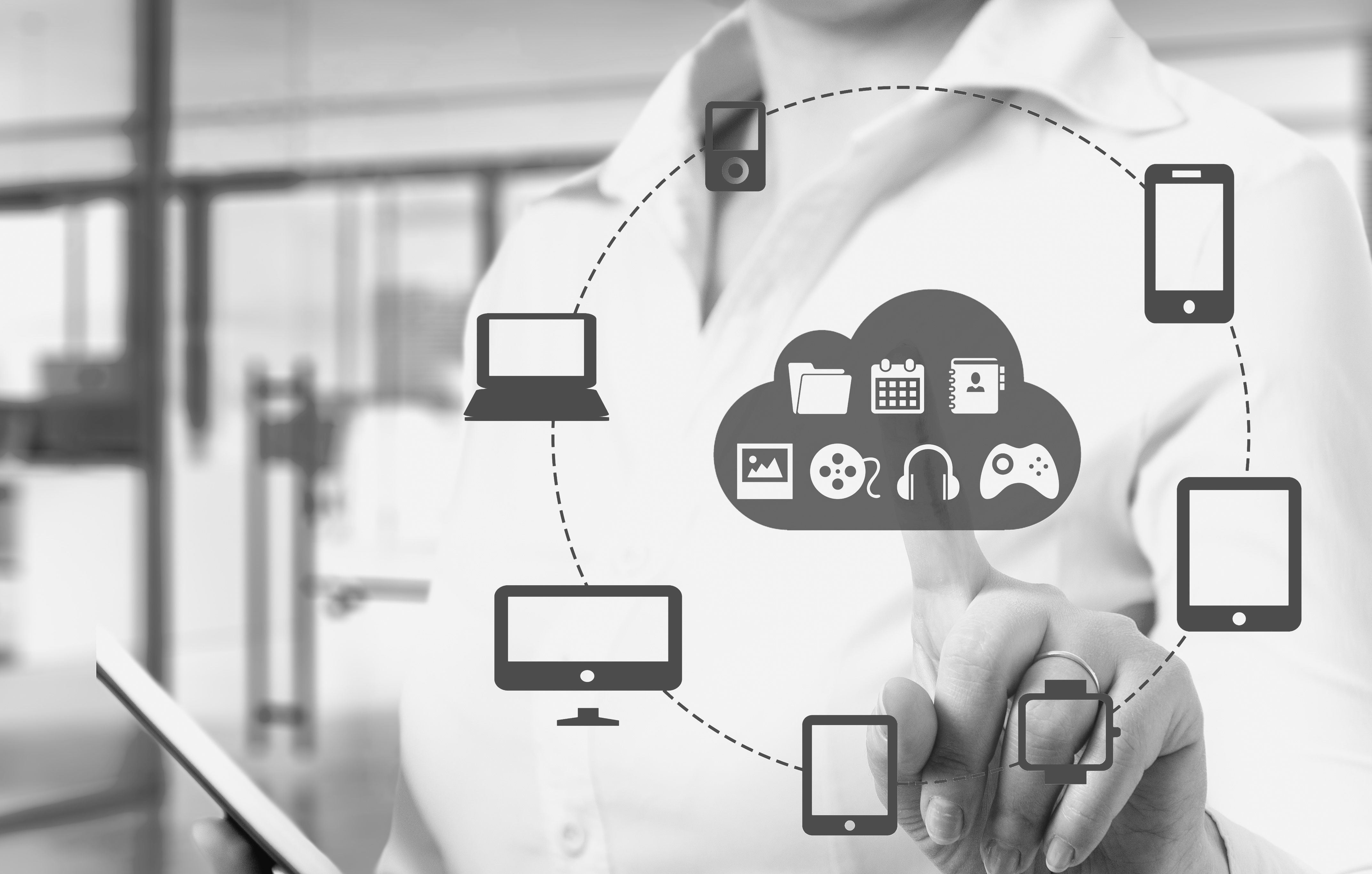Businesswomen touching a cloud connected to many objects on a virtual screen, concept about internet of things